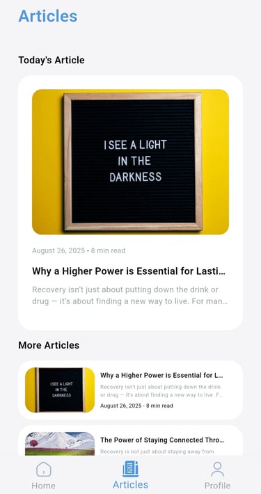 Motivational recovery reminders × Sobriety tracking and milestones × Daily affirmations and encouragement × Ongoing connection to recovery principles × Ongoing Patient Engagement × Extend Care Beyond Discharge × Improve Long-Term Outcomes